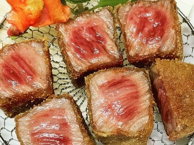 高知で串かつの有名店、「風来屋」。遠方から訪れるお客様も多い。串かつメニューは定番の肉や野菜、魚介類から、フルーツ、アイスまで食材は100種類をこえ、その中から季節に合わせて旬の食材を取り入れた40種類以上のメニューが揃う。またひと工夫された串かつは、カレー風味の肉を詰めたレンコンやウニベースのタレ付きイカなどの逸品が食べられるのもこの店ならではだ。自分がストップするまで工夫をこらした食材が出てくる「お任せコース」も人気。こだわりの串揚げを、心ゆくまでご堪能ください。