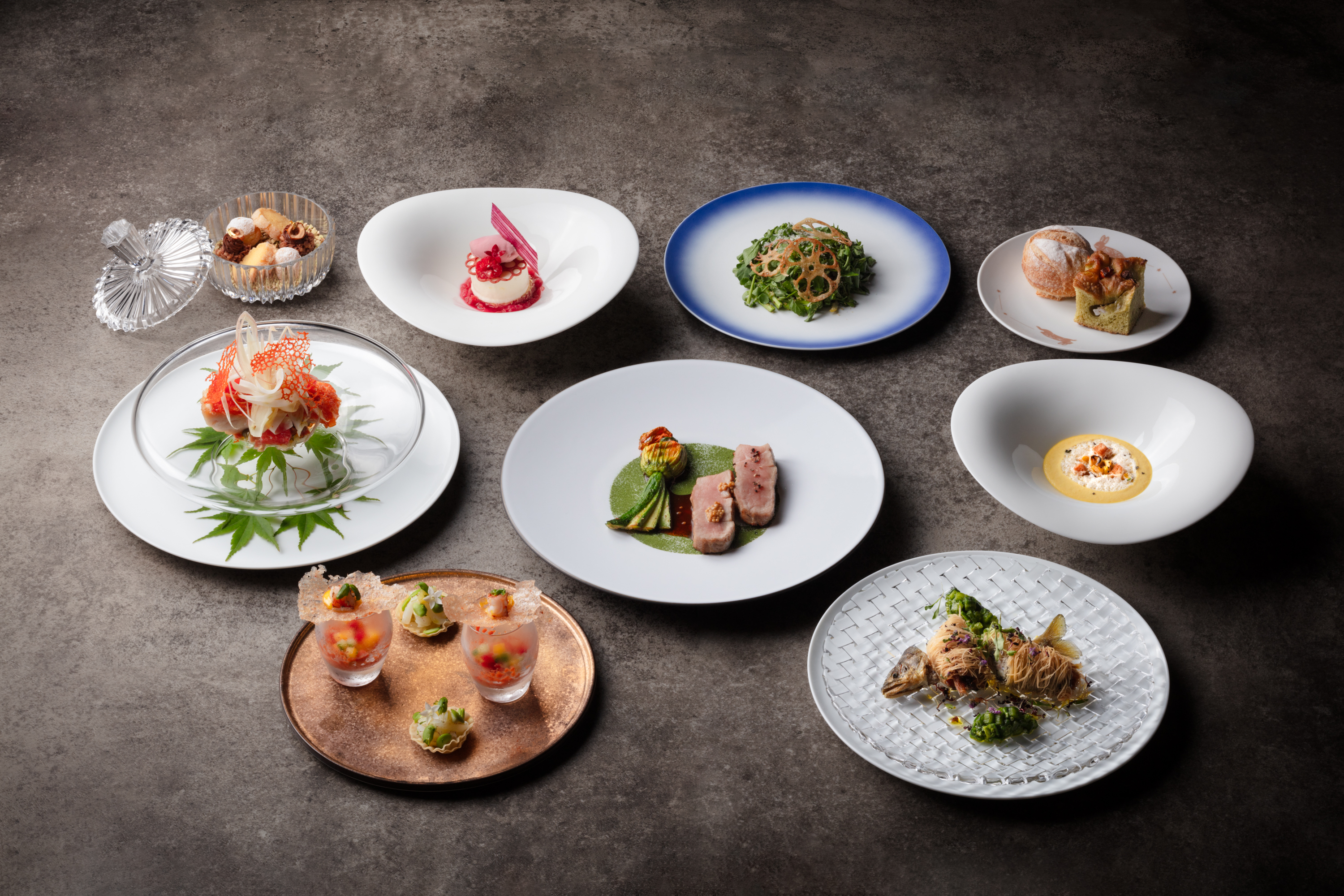 フレンチの匠の技が織りなす、季節の旬の味覚を愉しむ料理の数々。旨みの凝縮した軽井沢地野菜と極上の食材が、華やかなひと皿に姿を変えます。大自然に抱かれたレストランで、五感で味わう特別なひとときを。