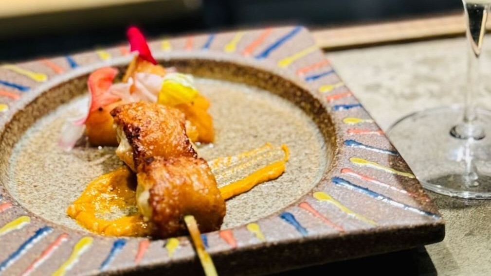 池尻大橋駅から徒歩約10分、三宿通り沿いにある【焼鳥 㐂た(きた)】は、2022年7月コロナ禍という逆境でのオープンにもかかわらず、評判が評判を呼び瞬く間に美食家が通う人気店に。店主は、焼鳥と日本酒が人気を集める【酉の 荻窪店】で15年間の経験を積んだ焼鳥職人の中村きたろうさん。コースでは、力強い旨み、豊かな風味、歯ごたえの三拍子がそろった長野県のオリジナル地鶏「信州黄金シャモ」を中心に、厳選した旬食材に工夫を凝らした和創作料理が、計算され尽くした順番で提供され、コース終盤までおいしさの感動に出合えます。店内は広々としたL字型カウンターのほか座敷の個室もあり、さまざまなシーンにマッチします。