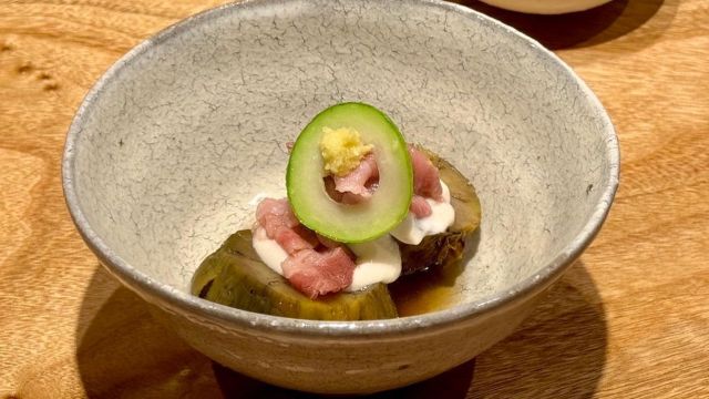テーマは「心地良いちぐはぐ」。「木と石、不揃いの椅子、一部を和柄の壁紙にするなど相反するものでもバランス良くミックスすることで居心地が良くなる」とオーナーシェフの髙木和也さん。料理も然り。フォン(だし)を丁寧にとるなど伝統を大切にしつつ、独自に編み出した革新的な技法をプラスして食感や味わいで驚かせてくれます。また、レストランとビストロの2つの顔を持っているのも画期的。テーブル席は前菜500円~、メイン2,000円前後のアラカルトでカジュアルに、カウンターは完全予約制で髙木シェフの才能を余すところなく味わえるコースで提供。フレンチに馴染みがない人も行き慣れている人も、楽しませてくれる懐の深いお店です。