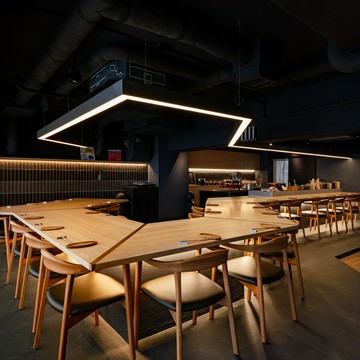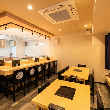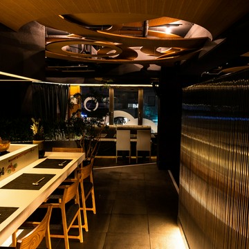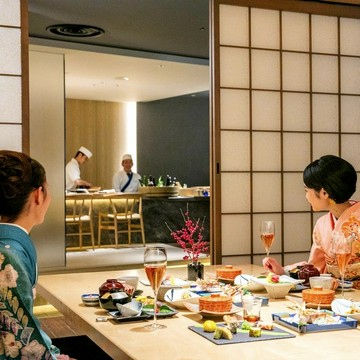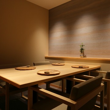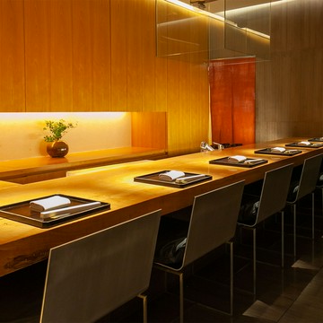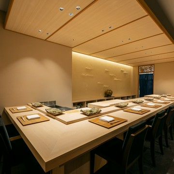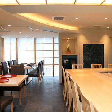 店内には会席料理のテーブル席に加え、白と黒の対比が斬新な寿司カウンターと大小3つの鉄板焼きカウンターを展開。さらに変化に富んだ意匠が施された、個性豊かな7部屋の個室とセミプライベートルームが設けられています。無垢材のフローリングと栃の木のツートンカラーで展開される美空間、寿司カウンターでは赤酢を用いてご用意する江戸前寿司や職人の感性が光る寿司会席などをお楽しみいただけます。