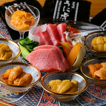 築地市場の場外に店を構える【うに虎 本店】。築地市場に全国から運ばれてくる雲丹を毎日仕入れているため、鮮度に自信があります。何より魅力的なのは、産地によるウニの違いを食べ比べできること。看板メニュー『皇帝』や『雅』などを味わえば、その甘みや旨み、香りまでもまったく異なることを実感できます。店内は、落ち着いた和の空間。ライブ感のあるメインカウンターは、職人を囲うようにつくられ、手際よく料理を仕上げる姿を間近で見ることができ、築地スタイルを存分に楽しむことができる魅力的な空間です。また、店内奥にはテーブル席が用意され、接待や記念日など大切な日にゆっくり過ごすのにオススメの空間です。