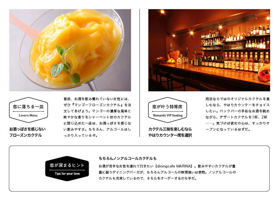 アルコールが進むほどに、打ち解けていくふたりの関係。デートの糸口として、お酒ほど頼れる存在はない。では、お酒が苦手な女性の場合は? そんな時こそ予約したいのが大宮駅前の【diningcafe MARINA】だ。なぜか。その理由は同店で楽しめるデザートカクテルにある。たとえば『飲むチーズケーキカクテル』は、その名の通りスイーツのように甘く、爽やかな味わいだ。「お酒じゃないみたい!」。そんな感嘆の声とともに彼女がグラスをくいくいと傾ければ、今宵のデートは成功したも同然だ。