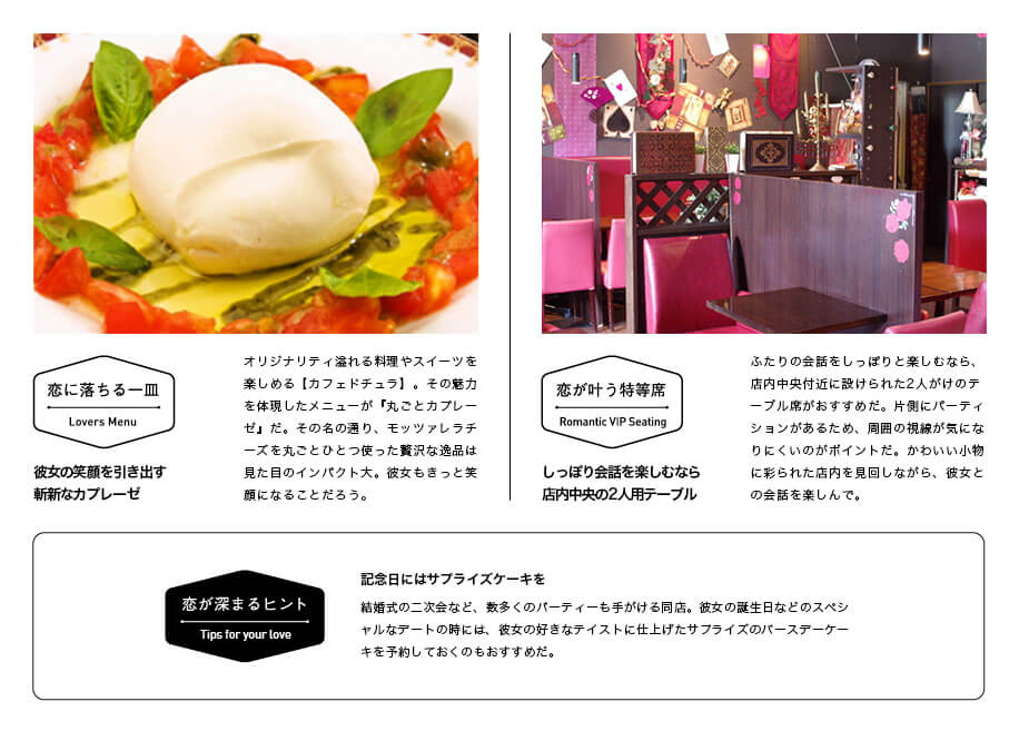 日々進化を続ける大宮駅前周辺で、彼女と一緒に街の変化を楽しむ散策デート。ぶらり歩きの後には、この街に点在する個性的なカフェをめぐってみるのも面白い。大宮駅西口ソニックビルの隣に店を構える【カフェドチュラ】も、そんな一軒のひとつ。ハロウィンやクリスマスなど、季節ごとにラブリーなアイテムで彩られる店内の雰囲気や、生パスタや雑穀米を使った創作料理の数々、そしてオリジナリティ溢れる手づくりスイーツ……。独自の創意工夫に満ちた店内には、発見と驚きが満載。彼女との会話もきっと盛り上がるはず。