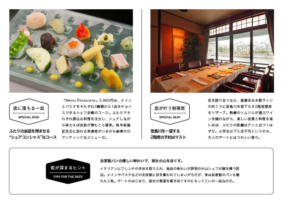 つくづく大人の恋が似合う街だと思う。ここは、大阪・北新地。ネオンが揺れる堂島川の畔に【リストランテ リナッシェレ ドウジマ】は建っている。築60年ほどの古民家をリノベーションした一軒家。格子戸を潜ると、昔ながらの太い梁や柱などに、和モダンなエッセンスを添えた美しい空間が広がっている。テーブルに並ぶのは、伝統的なイタリアンをベースにフレンチのエッセンスをプラスした、片山 裕貴シェフ渾身の一品。ゆらゆらと水面に乱反射するネオンを眺めながら、静かに恋を語らう。そんな大人デートにふさわしい店だ。
