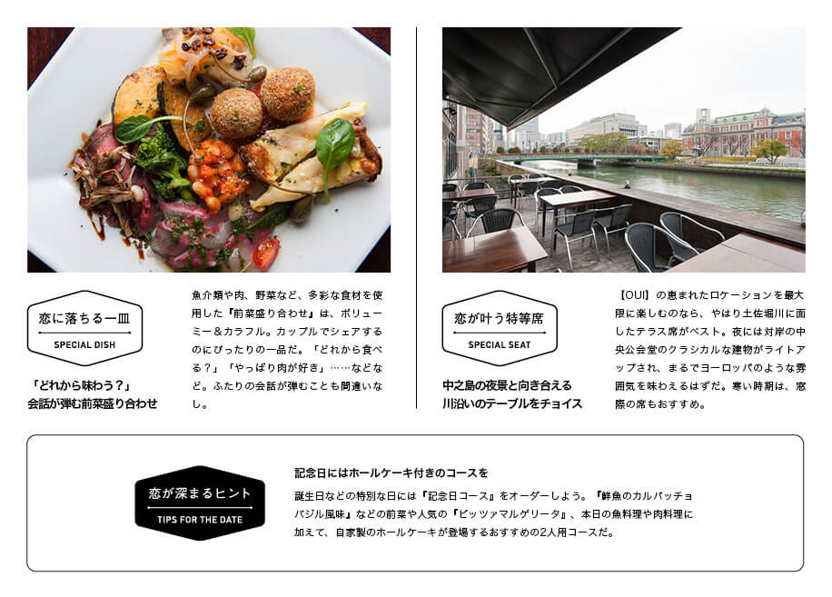 土佐堀川の対岸に建つ中之島中央公会堂がライトアップされた頃、恋人たちの夜が始まった。テーブルを彩るのは、シンプルで力強いイタリアンフレンチの逸品たち。【OUI】を訪れたカップルが決まって笑顔になってしまうのは、きっと美しいロケーションと美味なる料理の魔法にかかってしまうから。土佐堀川に面した川沿いのテーブル席でワイングラスを傾けながら、シェフおすすめの『NZ産 子羊背肉のロースト タスマニアマスタードのソース』をひと口。またひとつ、ふたりの笑顔が大阪の夜空に溶けていく。