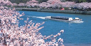 中之島界隈を巡るデートなら、大阪の中心部を流れる大川を遊覧する水上バス「アクアライナー」がおすすめ。【OUI】の近くの淀屋橋港からOAP港や大阪城港、八軒家浜船着場をめぐる1周約1時間のクルーズでは、中之島公園や大阪城の姿を水上から一望できる。特に桜の花々に彩られた春は、水上遊覧のベストシーズンだ。