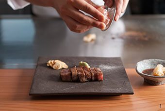 色とりどりのネオンが輝き、人々が足早に行き交う繁華街、ミナミ。その喧噪から逃れるように、とあるビルの最上階へと向かう。【鉄板料理 嵯助】の扉を開けると、そこには、凛とした上質な空間が広がっている。目の前で展開されるのは、大阪の名門ステーキハウスで腕を磨いた田仲重希シェフ自慢の逸品。前菜からメイン、デザートまで、すべて鉄板の上で調理されるコース料理は、創意と工夫に富んだ鉄板料理の新基軸だ。さらに、窓の外に目をやれば、きらめく道頓堀の夜景。恋する大人ならひとつは知っておきたい、隠れ家のような店。