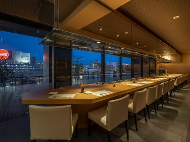 那珂川を挟んでキャナルシティ博多の向かいに位置する【鉄板焼なか乃】。極上の魚貝類や黒毛和牛を使い、抜群の火入れ具合で焼き上げる鉄板焼きが食べられる名店です。旨みがつまった身と濃厚なソースのバランスが絶妙な『活オマール海老』や、それぞれの魚に合った季節のソースで味わえる『鮮魚』などどれも逸品揃い。ミシュランガイドで星を獲得したのも納得の味わいです。店内にはホールの他にゆっくりとくつろげるスタイリッシュな個室が三つ用意されており、ファミリーや少人数のグループにおすすめ。夜になると、窓の外には美しい夜景を望むことができます。料理長渾身の品を満喫しながら、贅沢な時間を過ごしてみてはいかが。