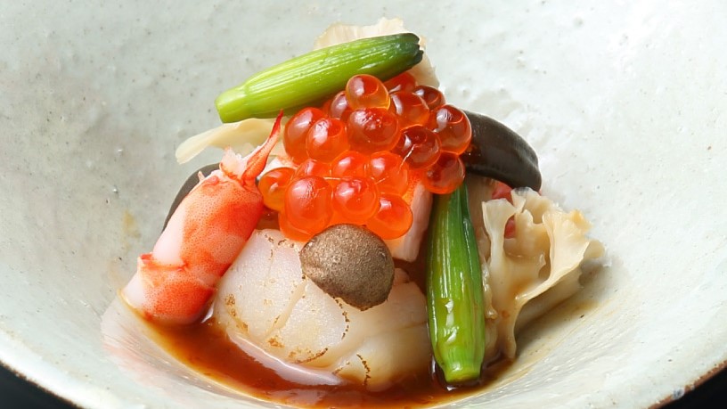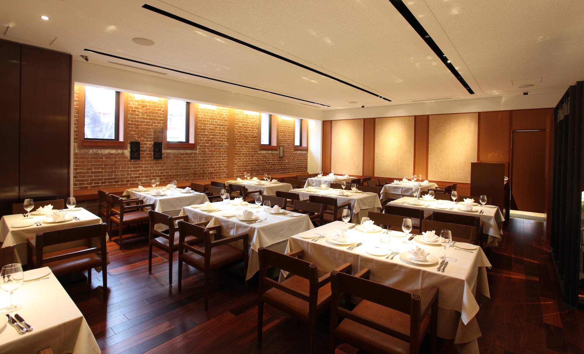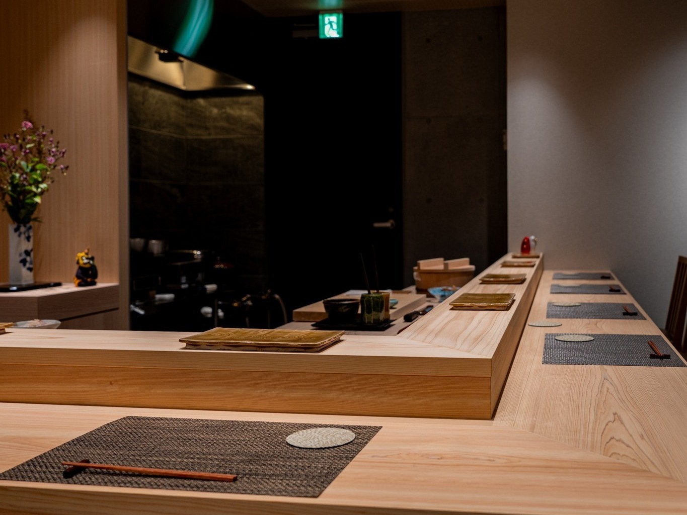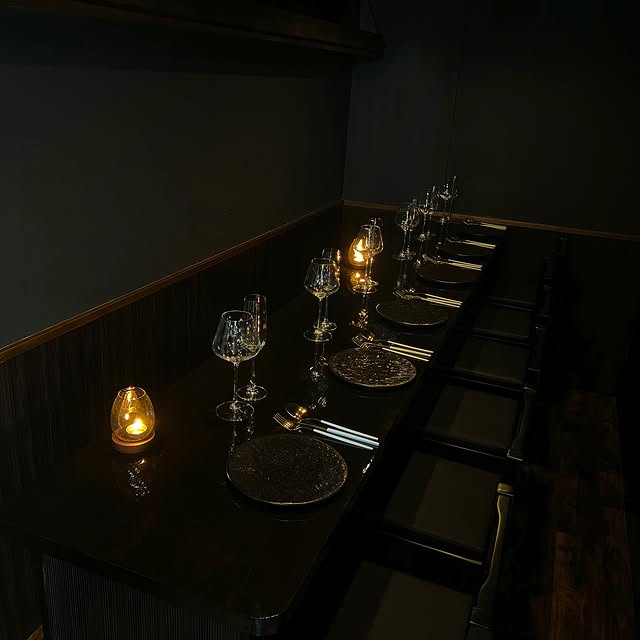 レストラン内に広がる、大きく贅沢なコの字カウンター。食材を切る音、鍋の中で奏でる音、目の前で完成していく料理たち。食体験レストランへようこそ。
