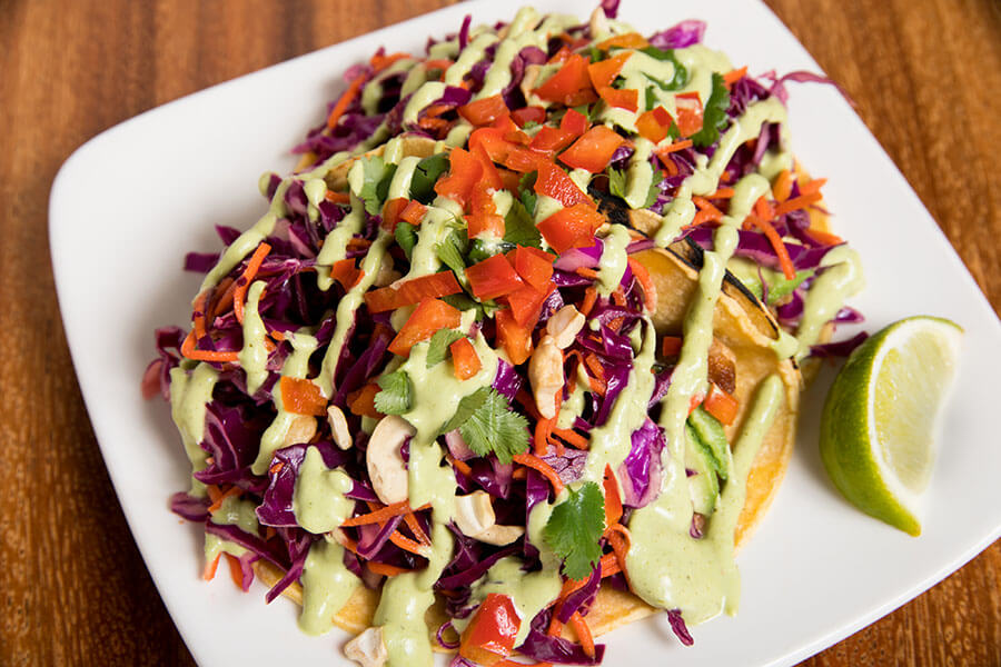 生野菜に潜む焼き豆腐がアクセントの『タイタコス($12.75)』。トルティーヤはコーンでできたグルテンフリー